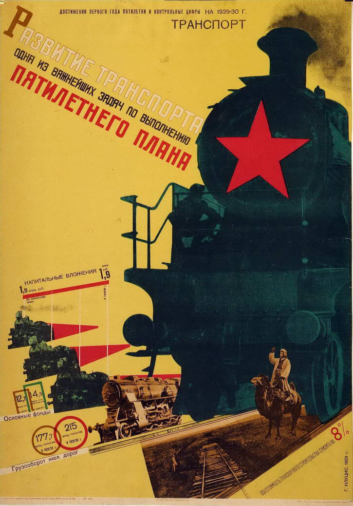 Густав Клуцис. «Развитие транспорта — одна из важнейших задач по выполнению пятилетнего плана». 1929
