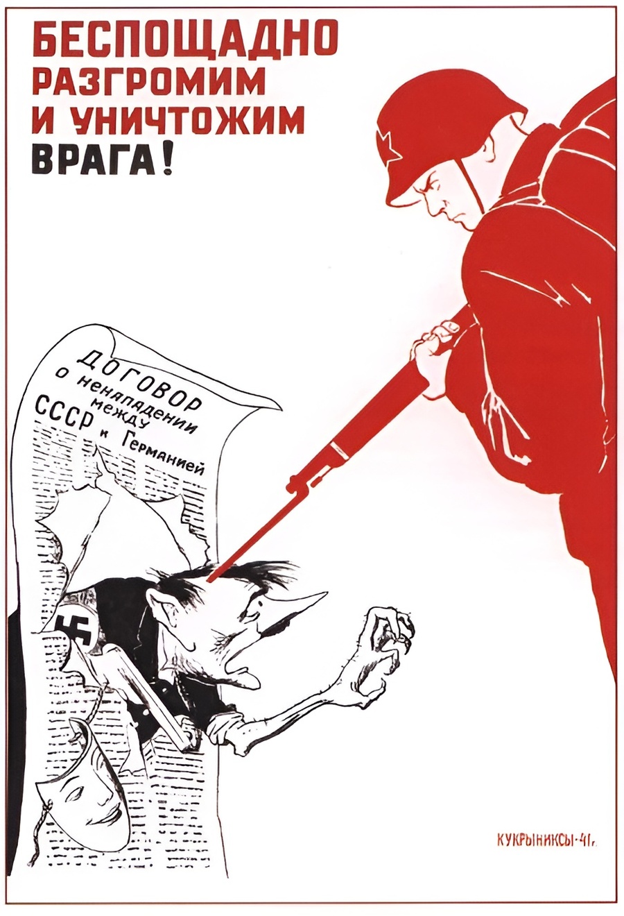 Не будем далеко уходить от ранее упомянутой мной карикатуры. В советских плакатах военного времени немцы изображаются исключительно в сатирическом ключе