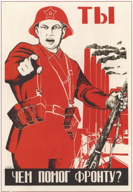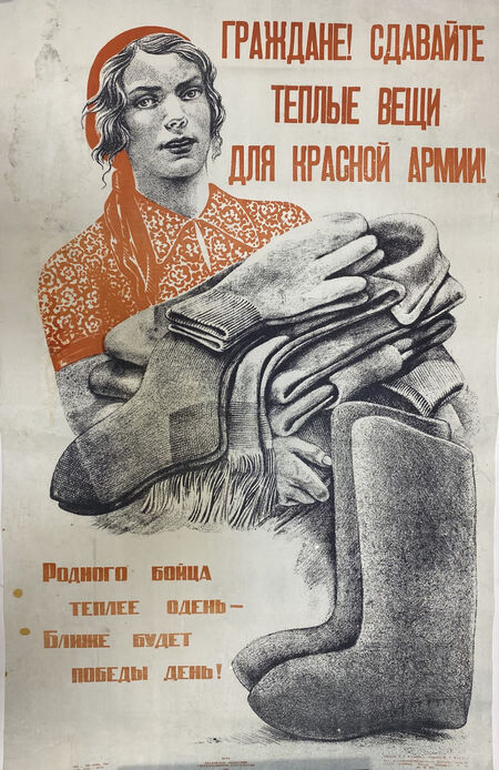 Д. Моор. «Ты чем помог фронту!». 1941/ Н. Денисов, Н. Ватолина. «Граждане Советского Союза, сдавайте тёплые вещи для Красной Армии, мужественно сражающейся с фашистскими бандами!». 1941