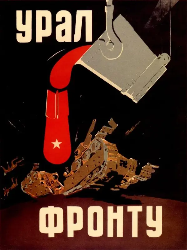 Э. Лисицкий. «Все для фронта! Все для победы!». 1942/ П. Караченцевой. «Урал — фронту». 1942