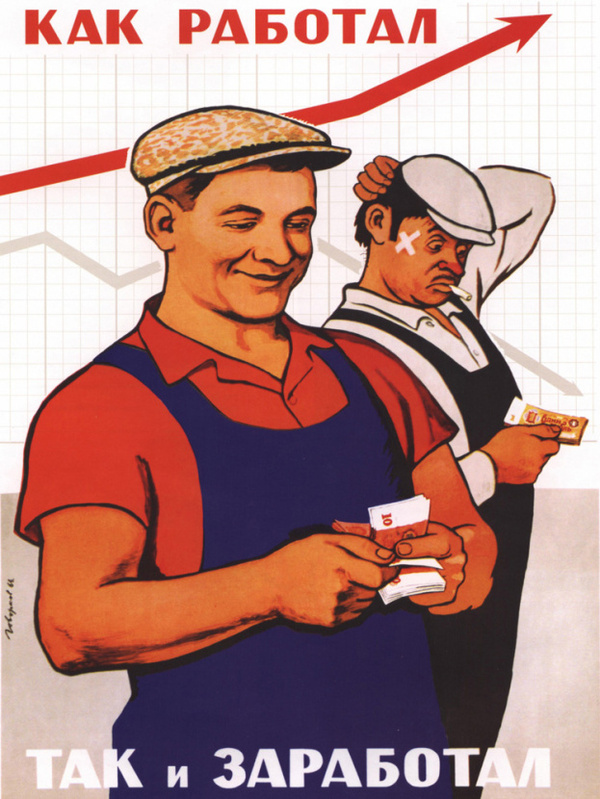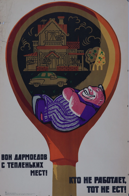 О. Масляков, Е. Цвик. «„Вон дармоедов с тёпленьких мест! Кто не работает, тот не ест!“». 1961/ В. Говорков. «Как работал, так и заработал». 1964