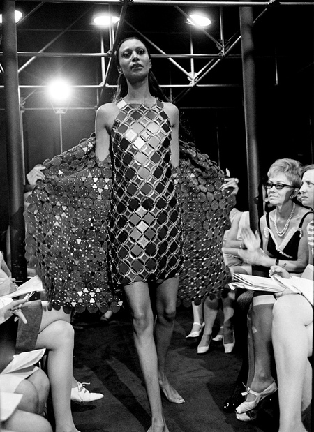 Модели демонстрируют мини-платья из алюминиевых дисков модного дома Paco Rabanne. Дизайнер Пако Рабан. 1968