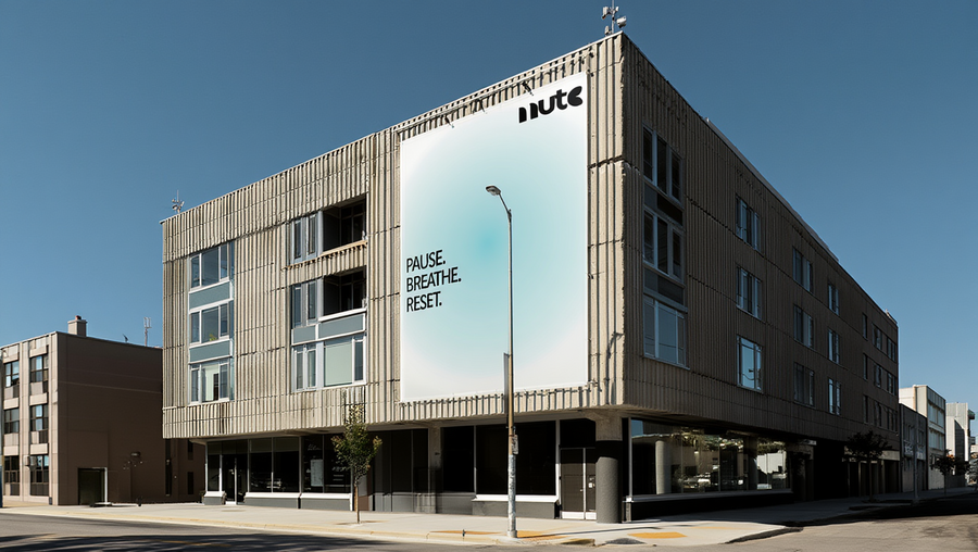 ReCraft: a modern, minimalist banner mounted on the side of a concrete building. The building itself has a raw, brutalist look with vertical concrete ridges and a large window to the left. The sky is clear and blue, adding to the tranquil, clean atmosphere of the scene. (промт сгенерирован в chatGPT по фото-референсу) reve: increase this picture to a 16:9 horizontal format and change the poster to the @1 poster (1 — один из сгенерированных постеров в предыдущем запросе)