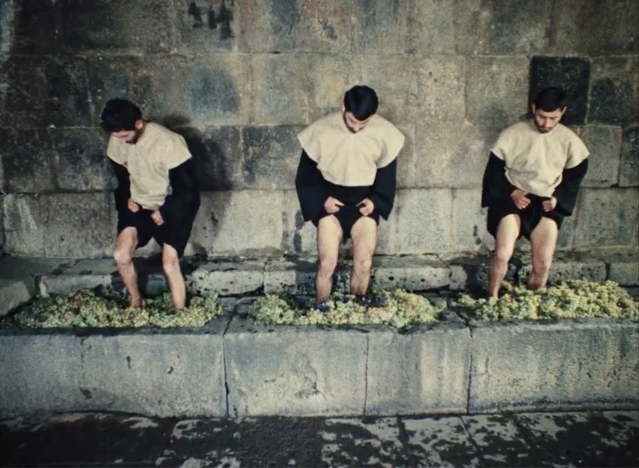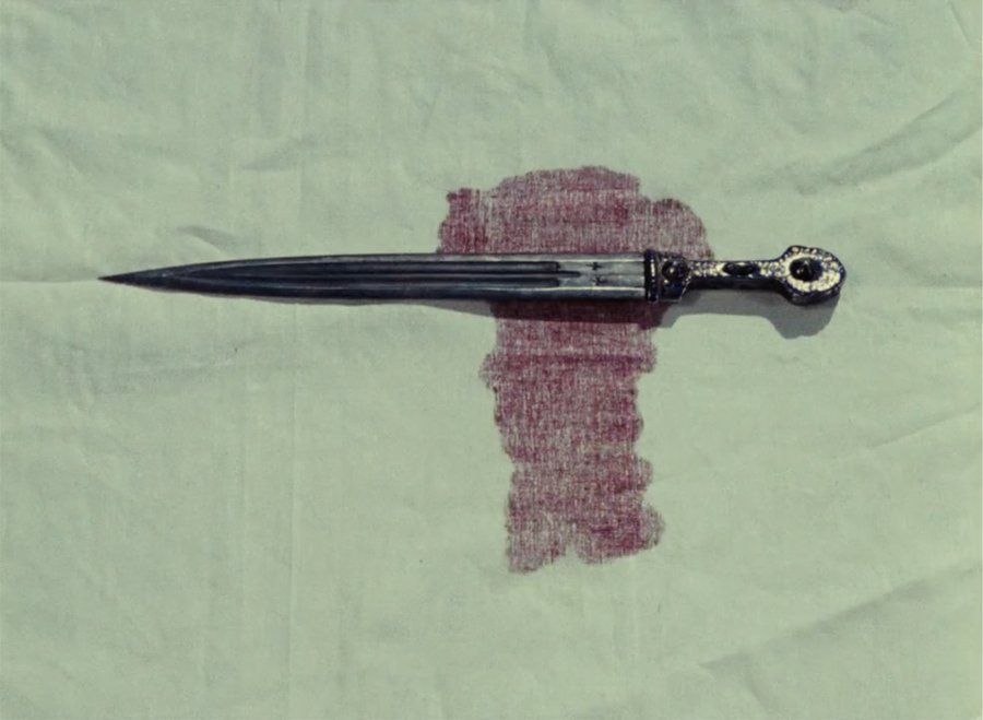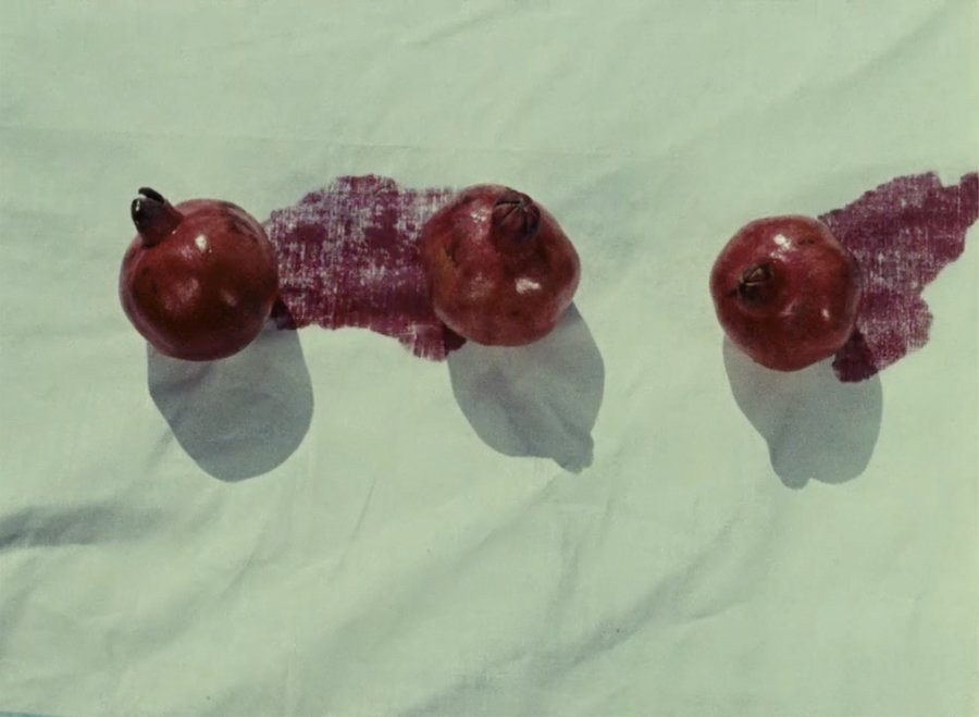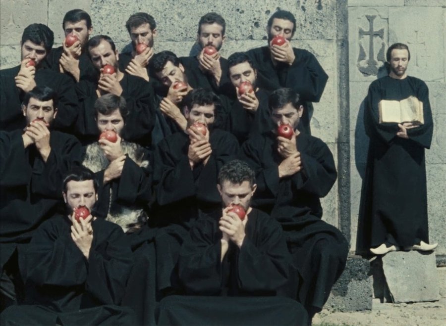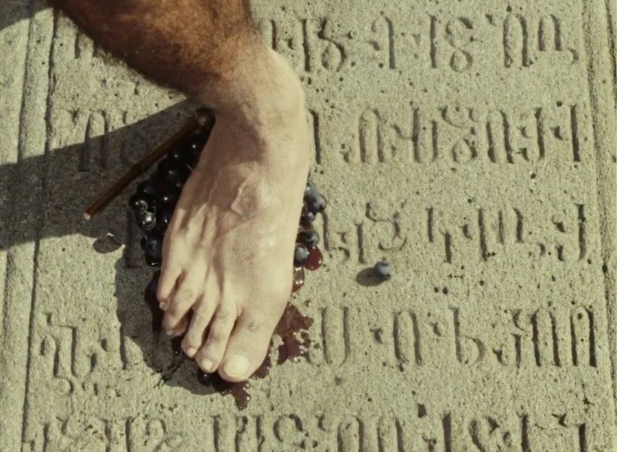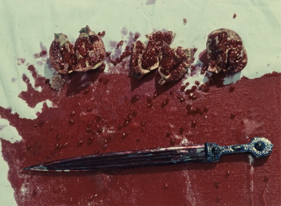 В самом начале Параджанов дает нам понять, какой будет основной конфликт фильма — выбор между земным и духовным. Гранат — символ жизни, который дает сок, ему противопоставлен кинжал, который лишает жизни, кровь похожа на цвет граната