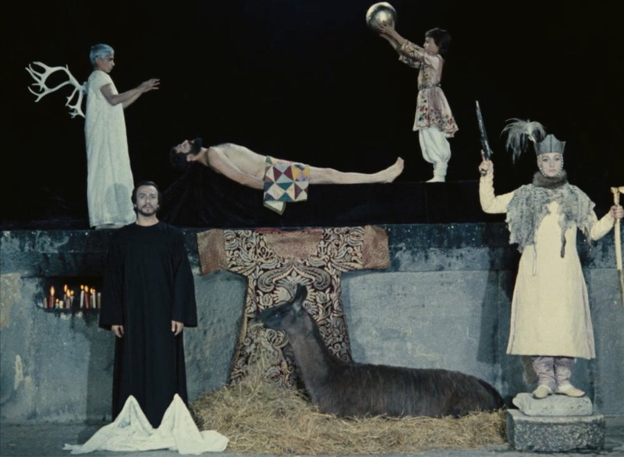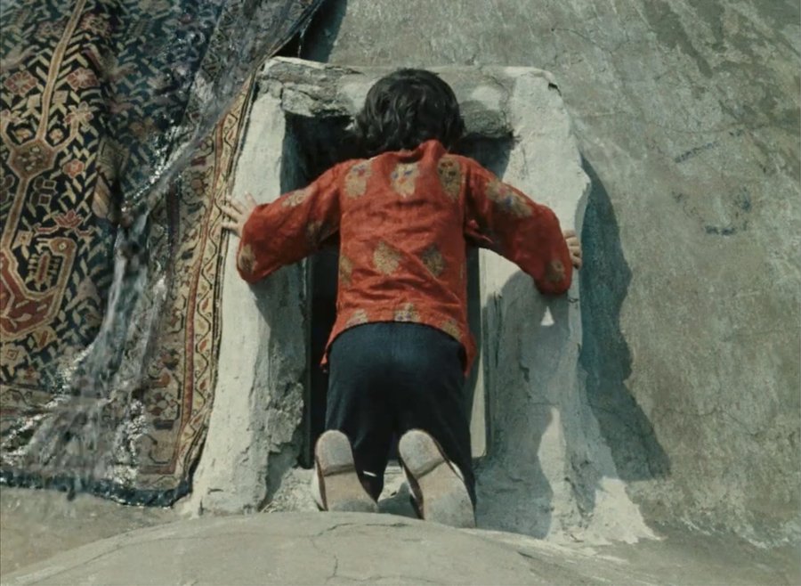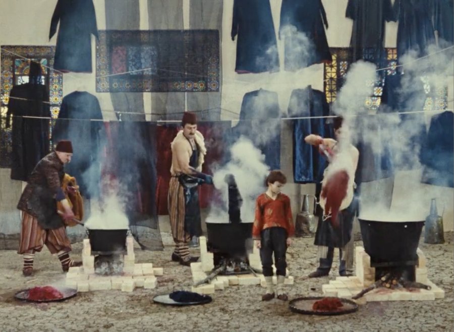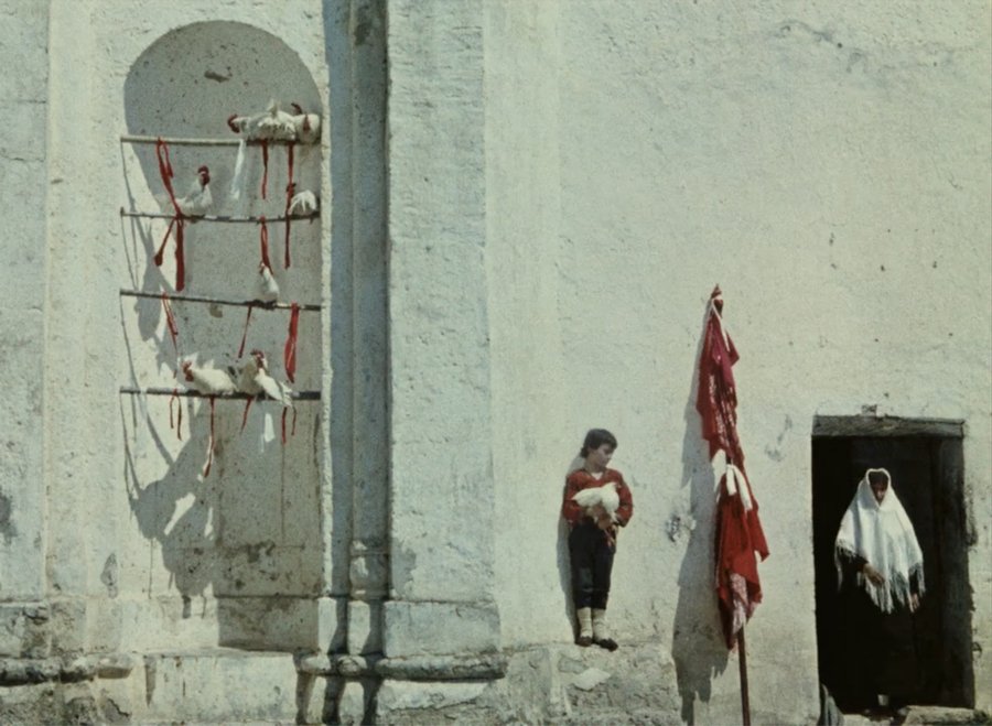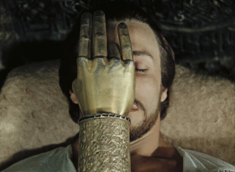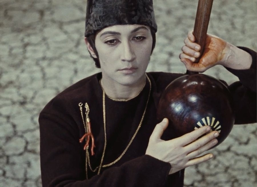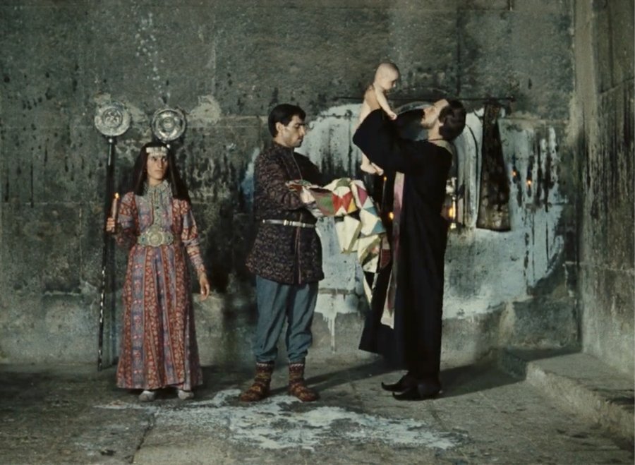 В самом начале Параджанов дает нам понять, какой будет основной конфликт фильма — выбор между земным и духовным. Гранат — символ жизни, который дает сок, ему противопоставлен кинжал, который лишает жизни, кровь похожа на цвет граната