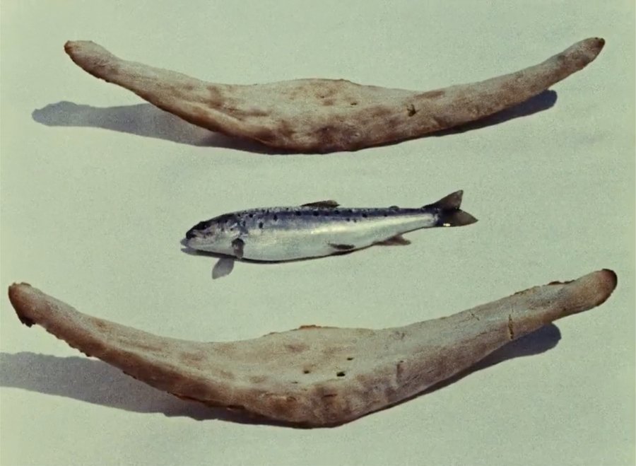 «В абсолютной тишине на черном экране возникает горячий ХЛЕБ. Из-за кадра рука бросает на хлеб живую рыбу…»