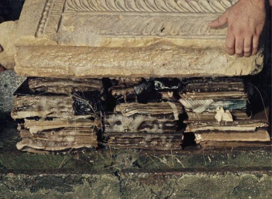 «Монахи толпились у книгохранилища… один за другим монахи молча выносят из книгохранилища намокшие книги…»