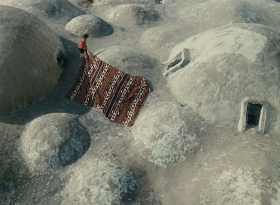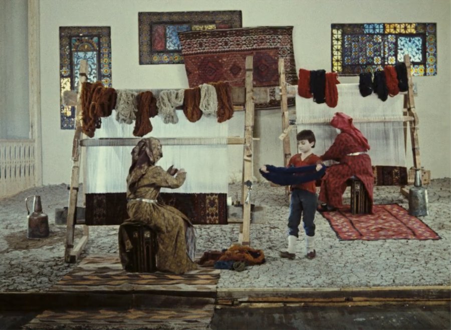 «Он смотрит на мир, возникший вокруг… Он видит грязную шерсть. Ее превращают в нити. И нити бросают в чан… Возникает цвет, желтый… голубой. Сохнут, стекая цветом, нитки… И ткутся ковры… на белых струнах… И щедрый ткач бросает ковры под ноги прохожим…»