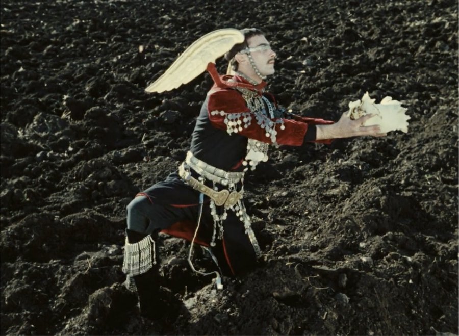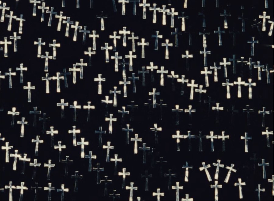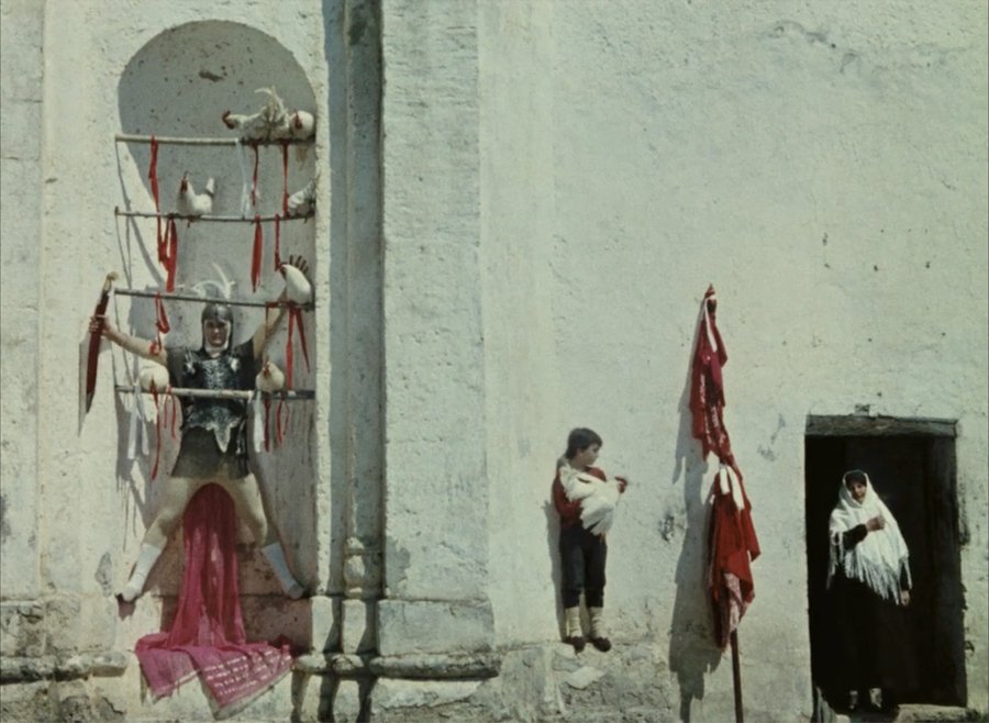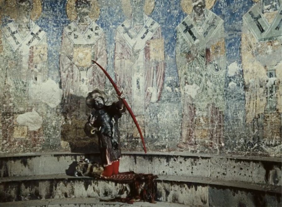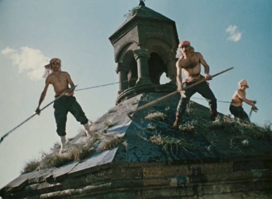 Здесь интересен монтаж, в кадре резко появляется святой Георгий, которому они молятся, одновременно он является образом их господина, того, кому они подчиняются. Тоже противопоставление духовного и земного.