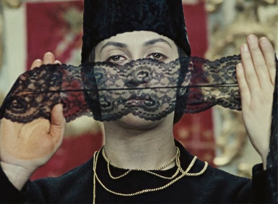 «И все монашки расступились, пропуская к Саят-Нове монашку в белых кружевах. Монашка в белых кружевах улыбаясь и в упор приложилась к плащанице и через золото Христа поцеловала Саят-Нову!»