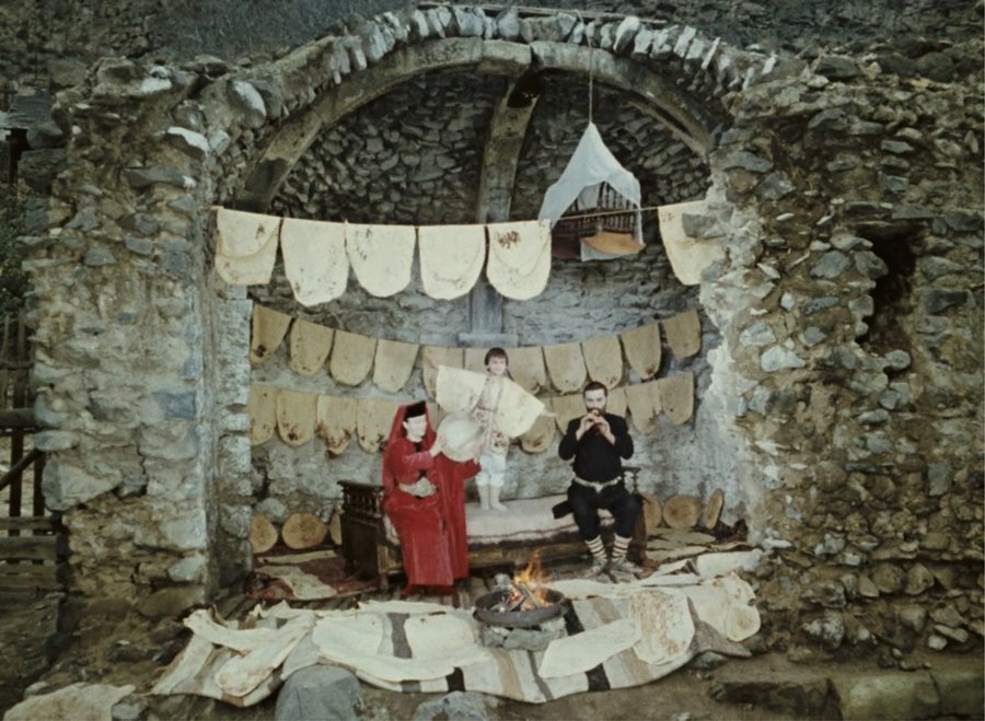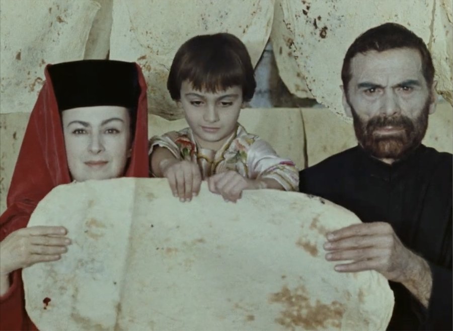 «С горячим белым хлебом перебегают улицы старухи. Старушки окружают Саят-Нову и тянут к его лицу горячий хлеб… Саят-Нова отломил кусочек и медленно разжевал горячий хлеб. Старухи тянули его за руки и втолкнули в отчий дом…»