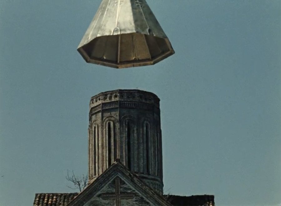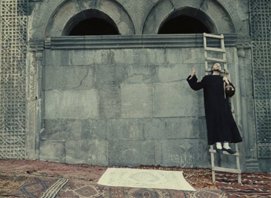 «В углу под куполом простой каменщик вмуровывал в стены сосуды-резонаторы. Каменщик увидел Саят-Нову, лежащего на камнях… И каменщик приказал Саят-Нове: — Саят-Нова — эркир… И Саят-Нова подчинился каменщику… Саят-Нова запел…»