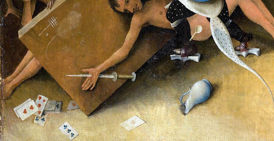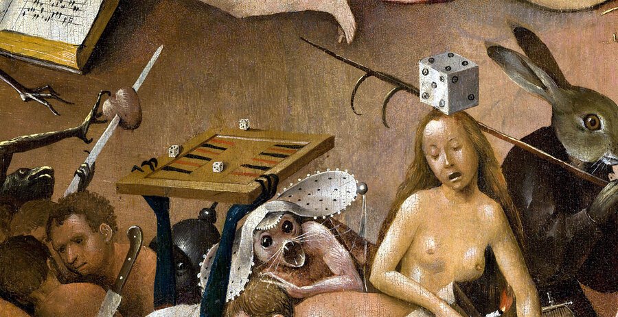 Каким бы странным и опережающим свое время не казался Босх современному зрителю, он все еще остается в рамках взглядов начала XVI века. В триптихе «Сад земных наслаждений» есть фрагмент, посвященный азартным играм. Герои, которые прикоснулись к азартным играм проткнуты насквозь, и даже так они продолжают тянуться к картам или костям. Это символизирует пагубную зависимость от азартных игр.