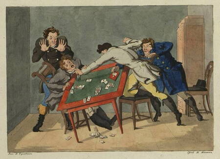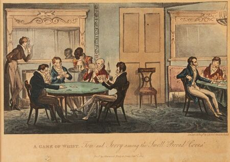 1. Игроки. Карикатура. Теребенев И. 2. Цветная гравюра «A game of whist; Tom and Jerry among the swell broad coves» Исаак, Роберт и Джордж Круикшенка.
