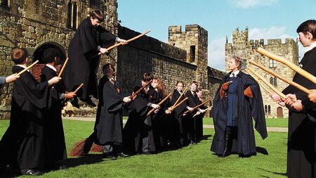 Одним из прототипов Хогвартса стал замок Алнвик в Великобритании, именно на его территории были сняты кадры урока полетов на метле. Замок обладает богатой архитектурной историей, он часто перестраивался владельцами и менял свой облик. Считается, что он относится к нормандскому стилю, однако его фасад схож с готической архитектурой, когда интерьеры ближе к итальянской. Подобным разнообразием стилей замок Алнвик схож с Хогвартсом.