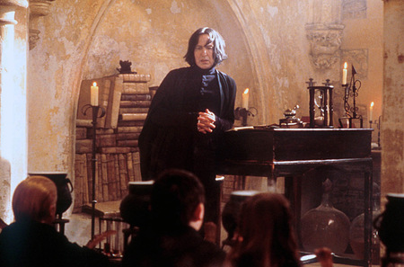 Совершенно иное впечатление производит кабинет профессора зельеварения, Северуса Снейпа. Местом съемок для этого кабинета стала крипта Аббатства Лакок. В отличие от большинства помещений Хогвартса, у кабинета Снейпа достаточно низкие потолки. Помещение выглядит достаточно пыльным, мрачным, почти лишенным декоративных элементов помимо нескольких колонн. Несмотря на то, что само Аббатство считается смешением романского и готического архитектурных стилей, но визуально кабинет зельеварения ближе к первому в силу своей массивности. Пространство создает мрачное настроение и отражает тяжелый характер профессора Снейпа.