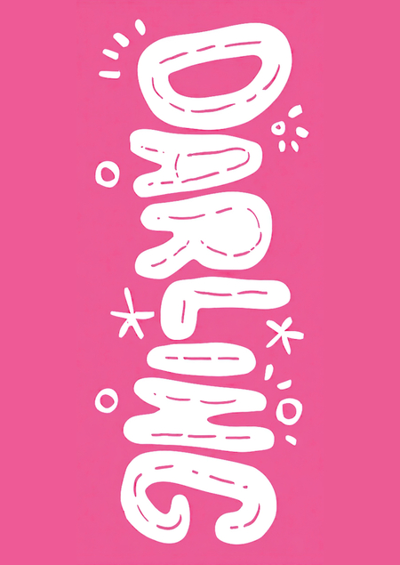 /imagine prompt: Logo for the cosmetiсы brand DARLING in bright pink color. The word «DARLING» is written in large, rounded, bubble-like letters with white outlines evoking a hand-drawn, graffiti-inspired style. The typography looks soft, fluid, and organic, with small decorative dots and irregular shapes enhancing its informal, creative feel, a simple yet powerful design, digital art. --ar 3:4