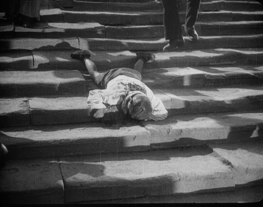 Так в одной из знаменитых сцен на лестнице в фильме «Броненосец Потемкин» ярко выражен принцип монтажа «аттракционов». Резкая смена кадров усиливает драматизм в итак тяжелом сюжете. Сначала мы видим бегущих вниз людей, умирающего мальчика, солдат и его опечатанную маму. Или падающую вниз коляску и эмоции женщины. Будь эти кадры сами по себе без резких столкновений, а друг за другом, это не вызывало бы у зрителя таких сильных эмоций. Режиссер играет на зрелищности, эмоциях и то как мы это все воспринимаем.