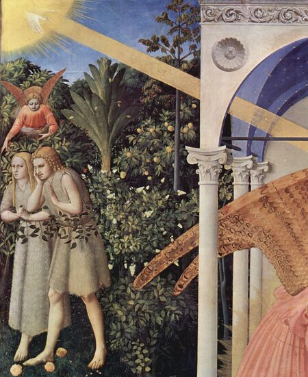 Фра Беато Анджелико. Изгнание из Рая. Деталь алтаря «Благовещение». Между 1430 и 1432 гг. / Пьетро Перуджино. Пьета. 1491–1495 гг.