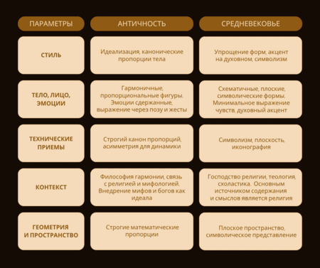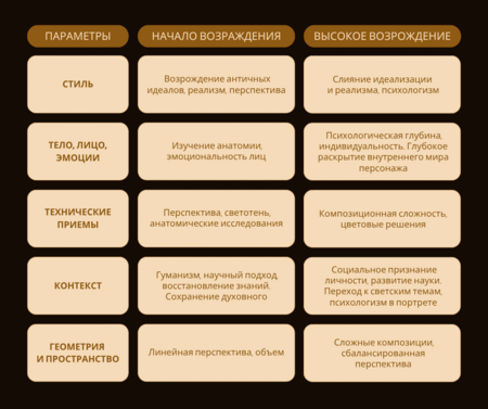 Античность была эпохой гражданской ответственности и ритуалов, культура подчеркивала идеалы гармонии и красоты, поддерживающие порядок. Средневековье — время господства церкви, где искусство служило религиозному воспитанию и укреплению веры, личность часто растворена в духовном контексте. Начало Возрождения совпало с возвратом к классике, ростом городов и торговли, что создало условия для индивидуализма и развития науки. Высокое Возрождение отражает рост значимости личности, развитие национальных государств, расширение знаний и культурного обмена, что отразилось в художественном многообразии.