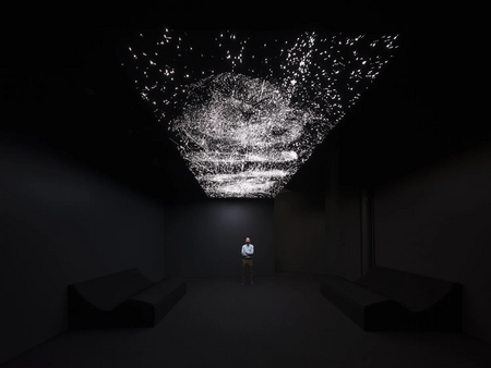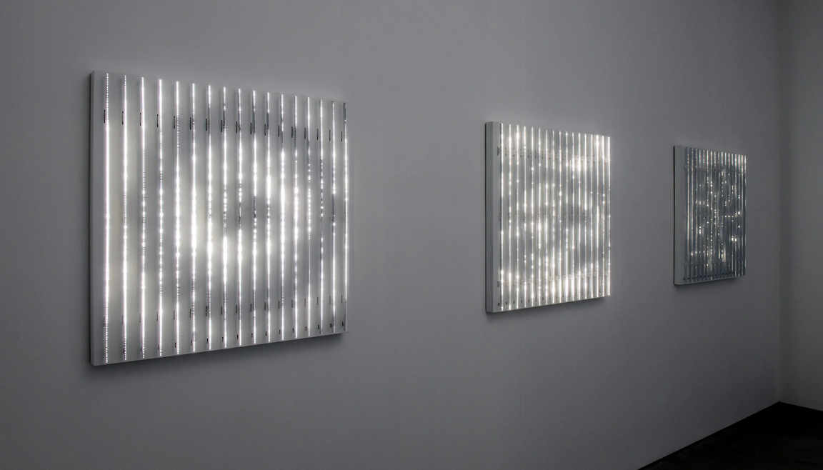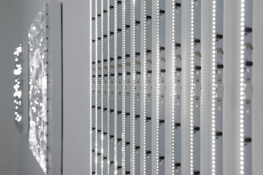 Виллареал также использует для своих работ использует трехмерные LED-структуры, подвешенные в пространстве. Такие инсталляции создают эффект объемного, почти скульптурного света, они помещают зрителя внутри среды, где световые импульсы формируют архитектуру, движущуюся вокруг него. Пространство возникает как цифровая глубина, которую создают комбинации света, тени и движения, оно бесконечно преобразуется, опираясь на алгоритм, а зритель воспринимает его почти как живой, изменчивый организм.