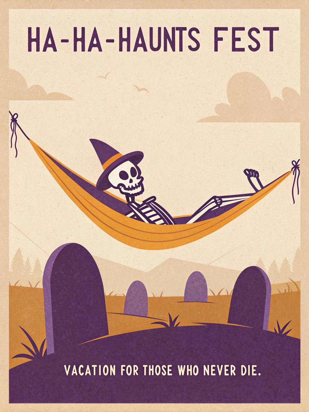/imagine prompt: A minimalist poster with a solid background in a warm beige color. In the center is a concise, stylized drawing of a smiling skeleton wearing a bowler hat, lazily lying in a hammock stretched between two tombstones. The shapes are simplified to geometric silhouettes, with no details — just outlines and flat color blocks. The skeleton is in dark purple, the hammock is bright orange, and the hat is yellow. Above or below the illustration, the festival name «Ha-Ha-Haunts Fest» is written in a thin but readable font in dark purple. At the bottom, in small print, is the slogan «Vacation for those who never die.» The overall composition is light and airy, with minimal clutter.