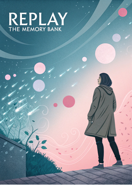 Store Layout: A bright, airy retail space with minimalist shelving and displays. The walls could be a soft white or a very pale grey. Lighting should be warm and inviting, highlighting the merchandise. Merchandise on Display: Hand Warmers: Prominently display the white, oval hand warmers with their signature pink and blue circular gradients and the «replay» logo. Show some in their resealable pouches, perhaps with a subtle sheen. Tote Bags: Feature the white tote bags with their bold red and pink/magenta straps and the «replay» logo. Some should be displayed neatly folded on shelves, while others might be hung or casually placed, showing their capacity. Cassette Tapes (representing «memory cartridges»): These are crucial for the «memory bank» theme. Imagine stylized, modern cassette tapes — not necessarily functional vintage ones, but designed with the «Replay» aesthetic. They should have the «replay» logo and the pink/blue circular graphics. Some could be in transparent cases, showing the «tape» inside, which might subtly feature a faded image or pattern related to memories (e.g., a ghosted photograph, abstract light trails). Place these in a dedicated section, perhaps resembling a library or archive. Branding & Visuals: «Replay» Logo: Consistently feature the «replay» logo in its black, sans-serif font across all merchandise and signage. Circular Graphics: The abstract pink and blue circular gradients and scattering dots should be a recurring motif. They can appear as subtle patterns on walls, display elements, or integrated into the merchandise itself. «Memory Bank» Theme Implementation: Interactive Elements (Subtle): Imagine small, transparent display cases where customers can (conceptually) «try on» or experience the memories associated with the items. This could be represented by subtle visual cues like projected soft light trails, faint holographic whispers, or even framed cards with evocative text like «Your Summer Day,» «First Love’s Echo,» or «Unforgettable Journey.» Signage: Use clean, modern signage that reinforces the «Memory Bank» theme. This could include phrases like «Replay: Your Archive of Moments,» «Collect Your Memories,» or «Everyday is a Replay.» Atmosphere: The overall mood should feel aspirational.