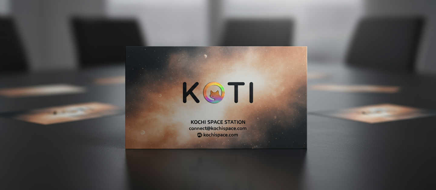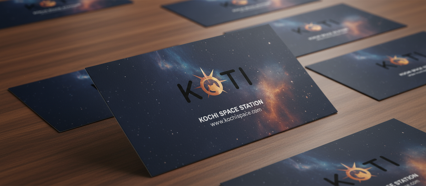 Нейросеть: LMArena.ai Промт: Create a realistic image of the business card design for the Kochi Space Station (logo in Figure 1) in a color scheme. Description: Elegant business cards with a holographic logo. Application: cards that are distributed at industry conferences, with minimalistic contact information and a heavenly background. The aspect ratio of the created image is 7:4