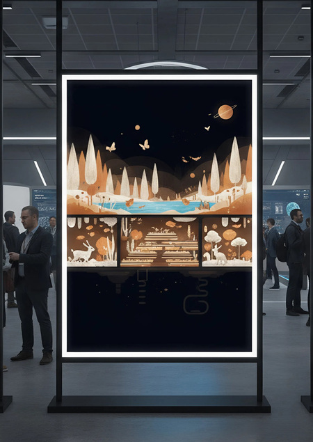 Нейросеть: LMArena.ai Промт: Generate a realistic design image of a series of corporate posters for the koti space station (logo in Picture 1) of three pieces in the color scheme from Picture 2. Description: Bright, eye-catching posters depicting the space station surrounded by animals and colorful scenes of a recreated environment. The slogan may sound like this: «Home beyond the stars.» The posters are in the environment: at events related to space. The aspect ratio of the generated image is 16:9