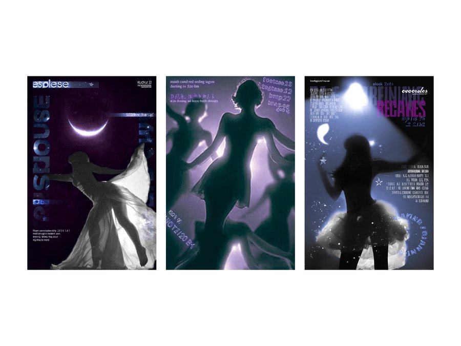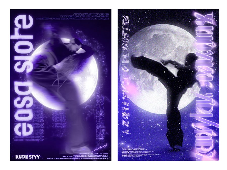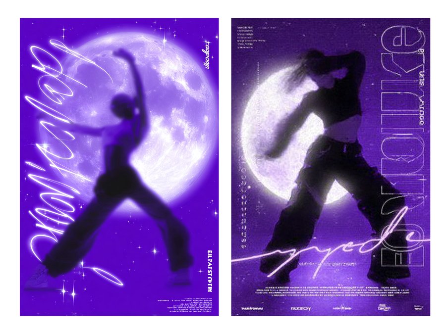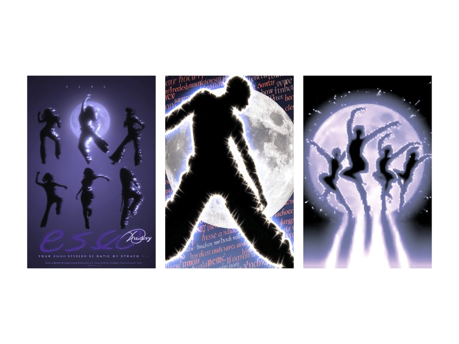 /imagine prompt: Make a poster for the Eclipse dance studio like a cool designer, in Y2K style, with different glow effects and blurred silhouettes of dancer dancing either hip-hop or contemporary, but naturally against the backdrop of a huge moon and stars. Use the Kudry font as an accent.