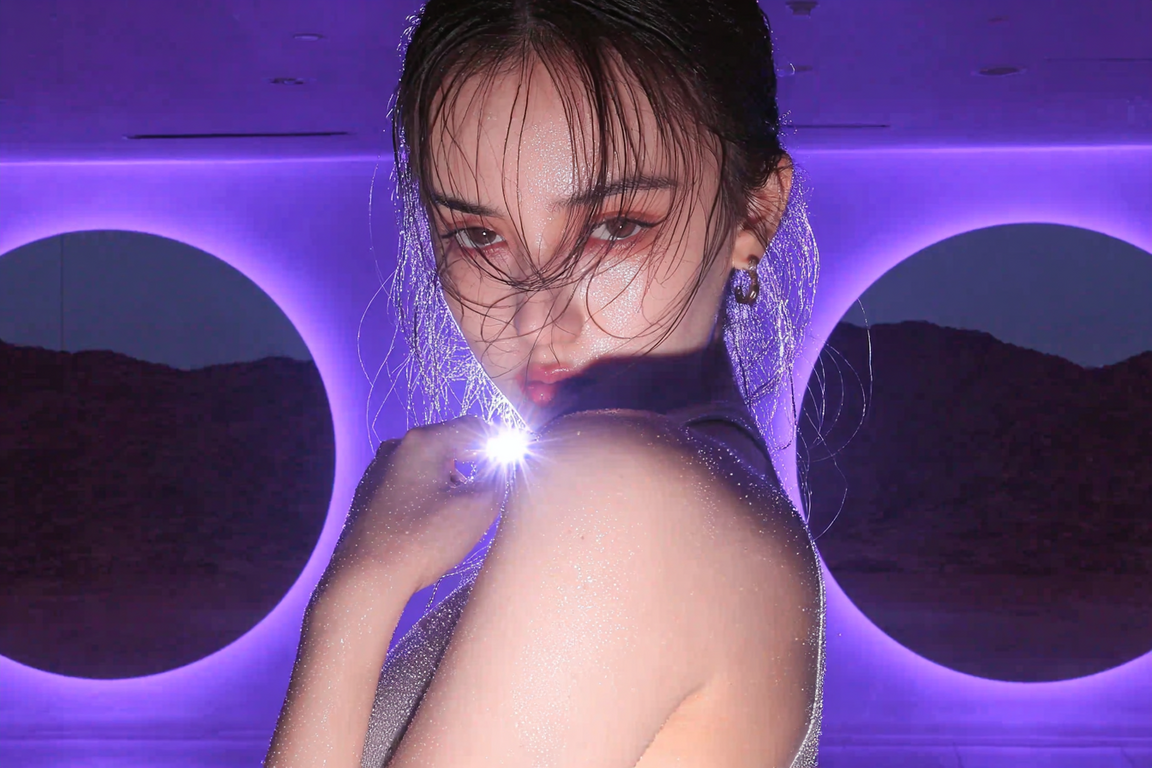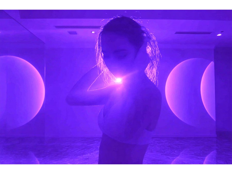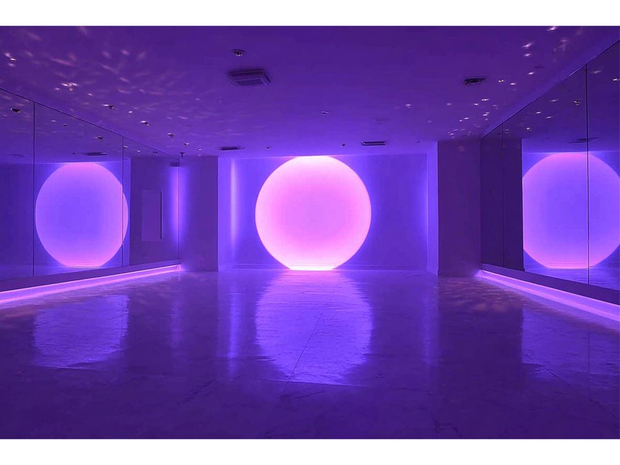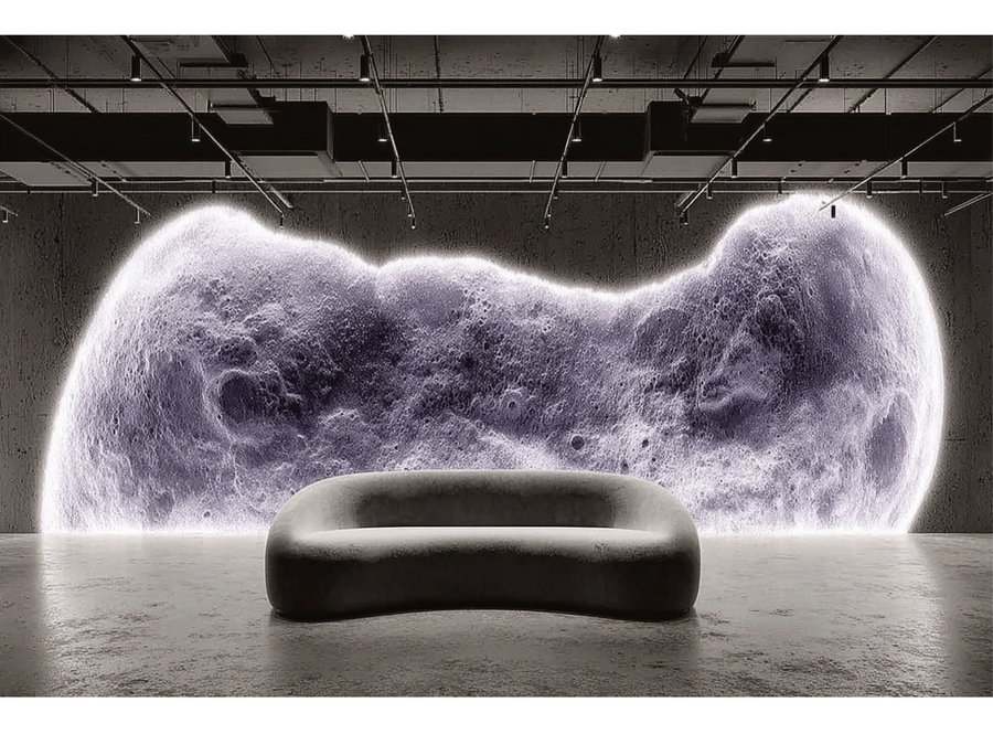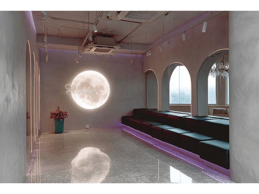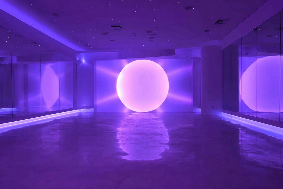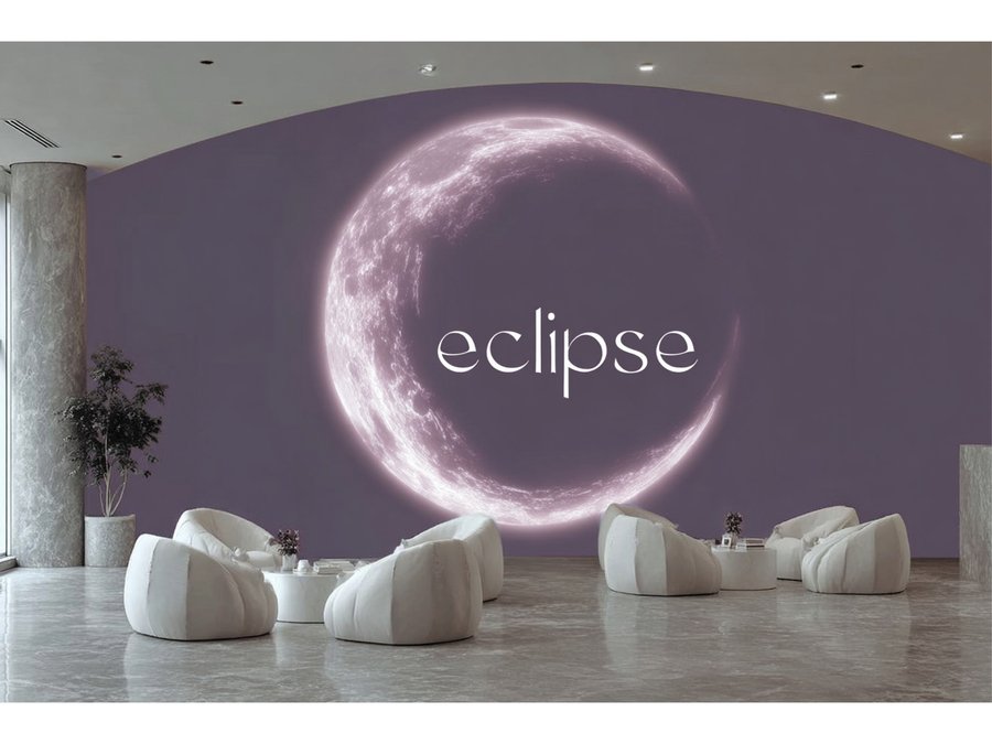 /imagineprompt: https://radikal.cloud/i/26737fac8ccc.JIvooC Reception area of a dance studio named 'ECLIPSE', designed with soft neon purple lighting, featuring a large full moon textured wall as the main focal point. The wall moon uses natural moon texture, emphasizing purple hues, avoiding glossy or shiny surfaces. The studio logo 'ECLIPSE' is displayed exactly in Kudry font, integrated naturally on the wall without extending beyond it. Include a girls' photo zone with a large mirror framed or accented by deeper purple tones, creating a cozy yet modern atmosphere. The overall style is elegant, atmospheric, with soft matte textures and a harmonious balance between moonlight theme and neon purple lighting.