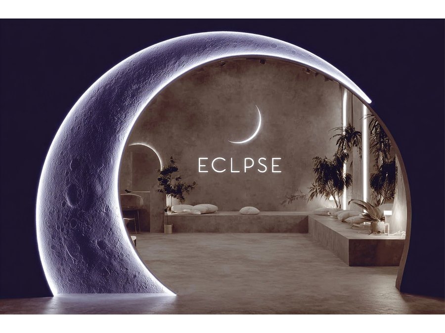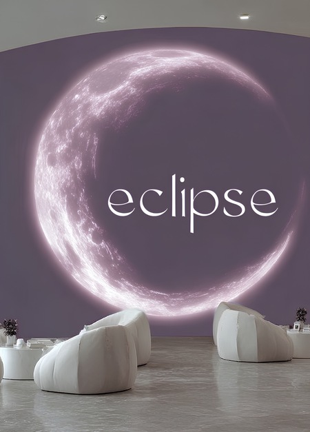 /imagine prompt: https://radikal.cloud/i/26737fac8ccc.JIvooC a logo with the word «eclipse» in white text, featuring curved lines and a modern design style. the background depicts the interior of a minimalist, moon-shaped house, with concrete walls and furniture made from light wood. the overall aesthetic is minimalistic, with subtle lighting, creating a simple yet elegant atmosphere.