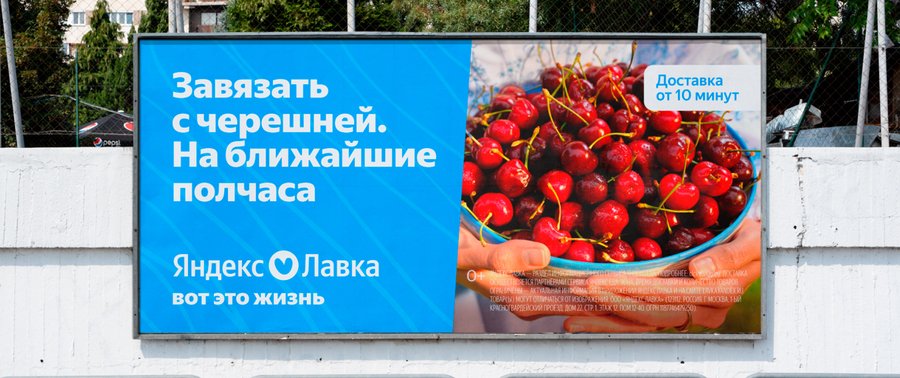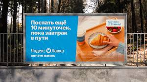 Реклама Яндекс Лавки часто строится на узнаваемых житейских ситуациях и лёгком самоосмеянии. Слоганы вроде «Поспать ещё 10 минуточек, пока завтрак в пути» или «Завязать с черешней. На ближайшие полчаса» играют на человеческих слабостях и неидеальности. Визуально бренд использует простые, насыщенные цвета и минималистичные композиции, а юмор возникает из текста. Такая самоирония создаёт ощущение «своего» сервиса — не надменного и не навязчивого, а понимающего и близкого.