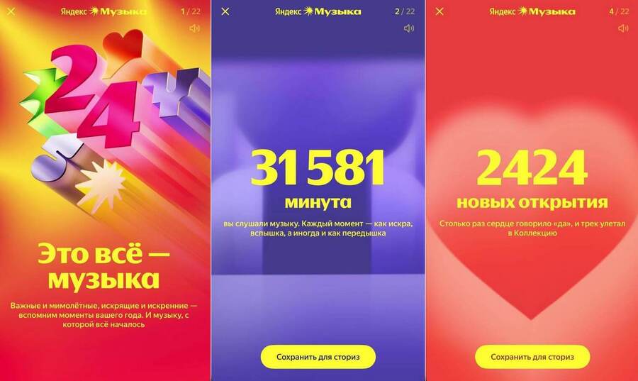 Яндекс Музыка. Проект «Музыкальные итоги года» (аналог Spotify Wrapped) использует мягкую самоиронию: «Ты слушал этот трек 100 раз. Всё в порядке?» или «Твоё настроение в июле — грусть и BTS». Такой тон вызывает симпатию и вовлечённость, потому что бренд не оценивает, а подыгрывает пользователю. Яндекс Музыка тем самым становится не сервисом, а собеседником, который умеет посмеяться вместе. Визуально проект оформлен в динамичной цветовой палитре, с простыми графическими элементами — это создаёт ощущение цифровой лёгкости и дружелюбия.