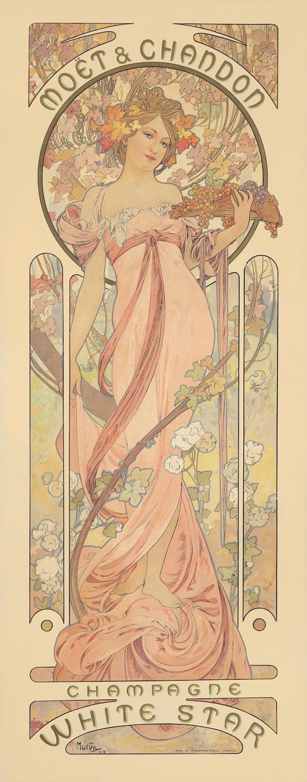 Также чешский художник создал рекламные плакаты для бренда Moët & Chandon. Его работы излучают роскошь и элегантность. В частности, виноградные лозы на одном из плакатов не только дополняют композицию, но и намекают на винодельческую тему. Стиль этих произведений можно охарактеризовать изящностью линий и утонченностью рисунка, что хорошо гармонирует с метафорами и ощущениями, которые передает бренд Moët & Chandon.