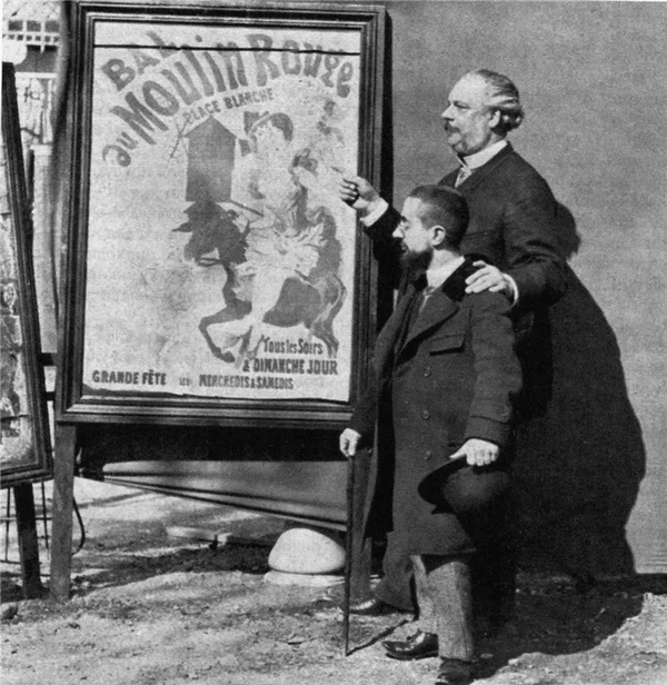 «Анри де Тулуз-Лотрек с Тремоладой, стоящий рядом с плакатом Жюля Шере 1889 года, Бал-дю-Мулен Руж, площадь Бланш», 1890 и Жюль Шере — «Бал-дю-Мулен Руж», 1889