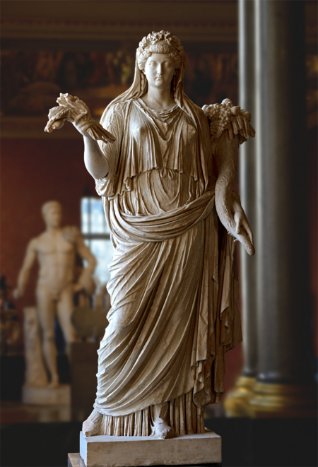 На данной работе я увидела схожесть с Деметрой, богиней плодородия. На данную древнегреческую богиню отсылает сочный фрукт, который она выжимает. Также на ее руке есть украшение в виде змеи, что также отсылает у мифу о том, как Зевс, возжелав Деметру, явился к ней в образе змеи.