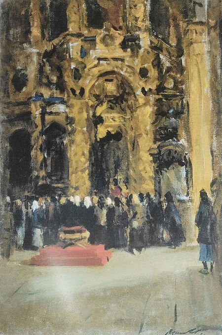 Важным примером такой трансформации является картина Виктора Цыплакова «Служба в Успенском соборе в Смоленске». Эта работа не только изображает традиционную церковную службу, но и демонстрирует величие русской православной архитектуры и литургии. Важность этой картины заключается в том, что она сохранила элементы православного культа, при этом акцентируя внимание на культурной и исторической ценности таких символов, как собор, служба, и сама духовность, воспринимаемая не только через религиозную практику, но и как часть культурного наследия.