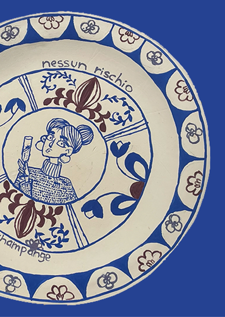 второе задание курса — создание изделий из белой глины. тарелка была расписана в стиле итальянской майолики. на тарелке изображен автопортрет, фраза «nessun rischio, niente champange» [рус. — кто не рискует, тот не пьет шапмпанское] и декоративные узоры, которые обрамляют изображение