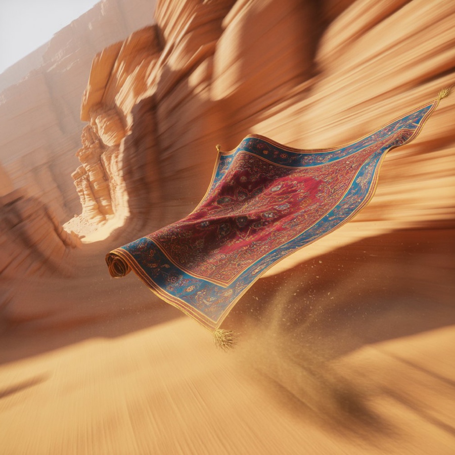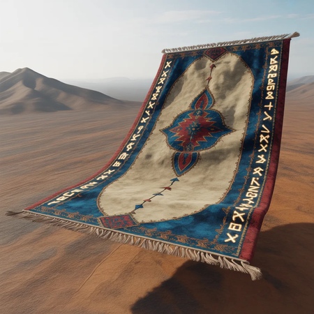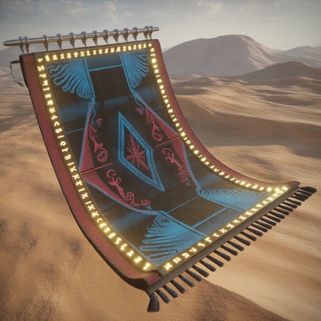 Realistic rendering of a flying racing carpet showcased on a desert backdrop, detailed fabric textures, glowing runes along the edges, vibrant blue and red motifs, metallic accents, light reflections, high detail