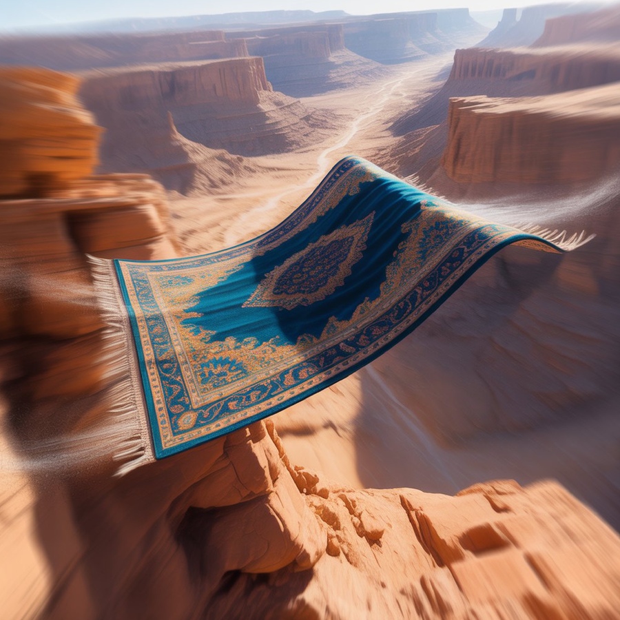Concept art of racing carpet soaring above desert canyon, dynamic motion blur