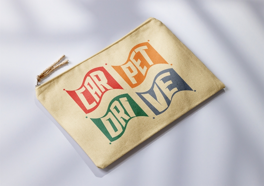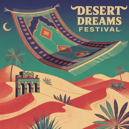 Design of a merchandise poster or banner, featuring a stylized flying carpet, event logo, and desert elements, with detailed branding, vibrant color palette of blue, green, red, black, and sandy tones