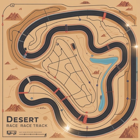 Realistic map of the desert race track with marked routes, key points, landmarks, styled with elegant lines, glowing accents, sand-colored base, detailed textures suitable for print or digital use