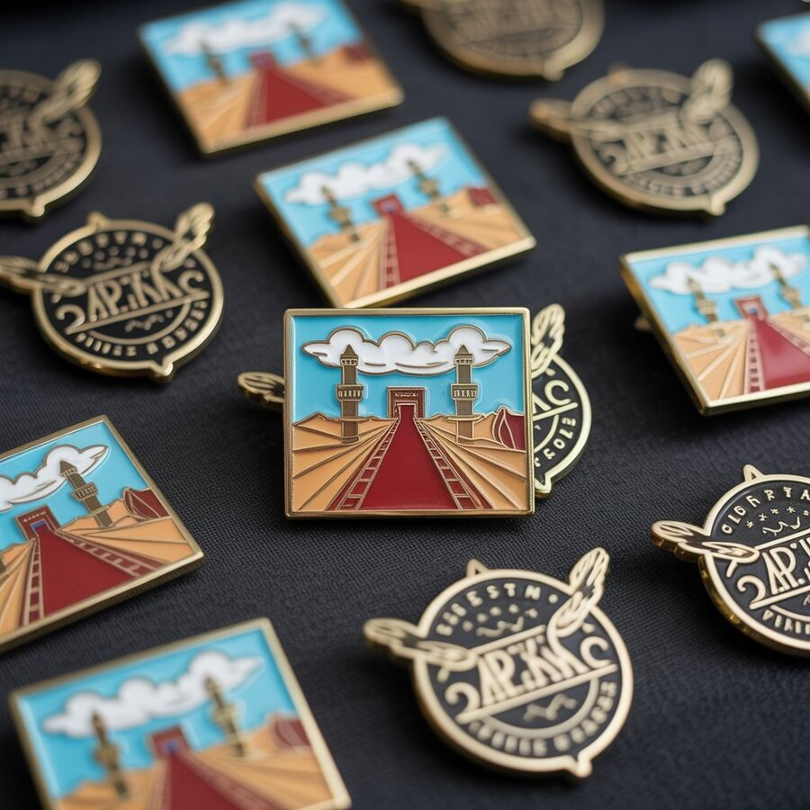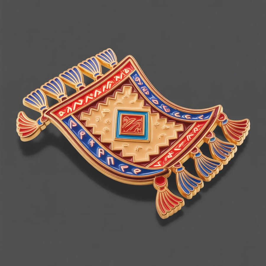 1-2. High-resolution realistic design of a flying carpet enamel pin, featuring intricate embroidery, glowing runes, detailed metallic edges, sand-colored background, vibrant royal blue and red accents, with subtle reflections