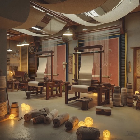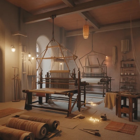 Interior of a workshop dedicated to crafting flying carpets, with weaving looms, fabric rolls, glowing threads, tools, ambient warm lighting, mixed textures of sand-colored and metallic surfaces, detailed and realistic