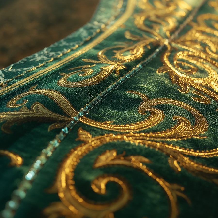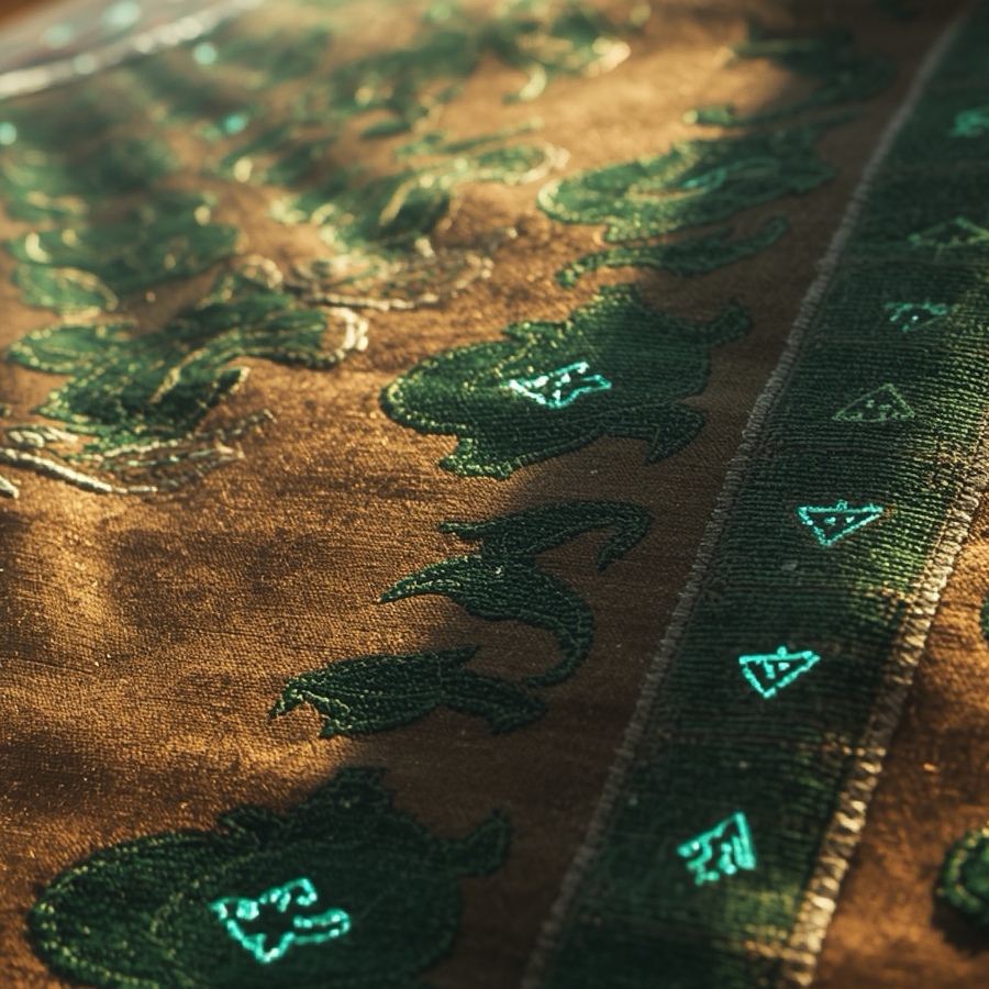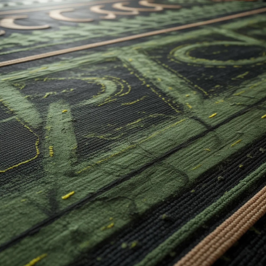1,3. Close-up of a racing carpet fabric with intricate patterns, glowing threads, sand-colored borders, weathered appearance, realistic lighting, subtle shadows, detailed stitches, in shades of green and black