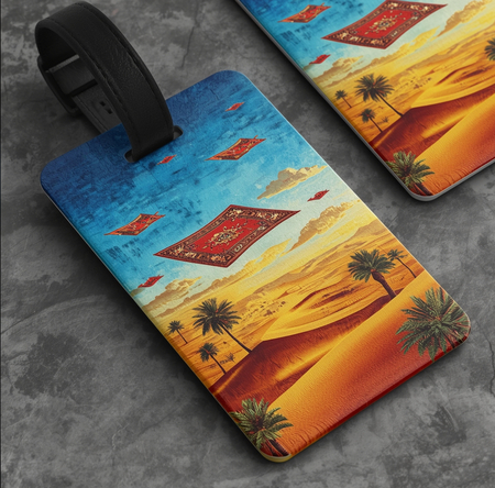 Design for a set of custom luggage tags, featuring flying carpets and desert scenery, textured with metallic foil and embossing, vibrant colors, durable realistic appearance