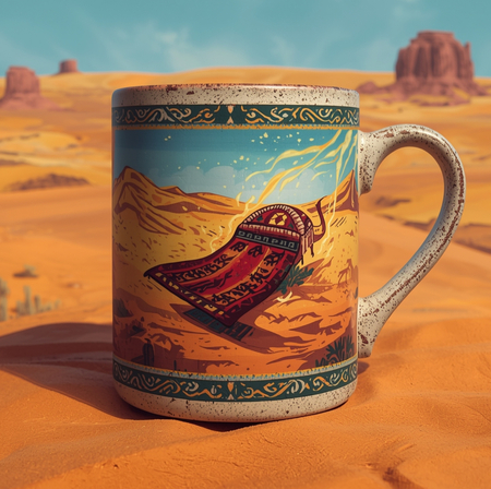 Realistic illustration of a ceramic mug with a painted flying carpet graphic, glowing runes border, desert landscape in background, colors matching event branding, detailed textures with a glossy finish