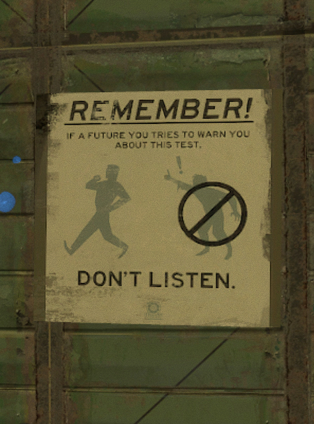 В отличие от распространненой дихотомии «утопия-антиутопия», игра не выделяет какой-то один сценарий возможного будущего как единственный правильный, — она оставляет в нарративе ироничные комментарии к каждому из возможных вариантов. Также основным местом действия игры является лаборатория, а персонажем, за которого мы играем, выступает некогда ее подопытный субъект. Это укрепляет нейтрально-наблюдательскую идею Portal о футурологических теориях как прямом продукте общественных надежд, ожиданий и страхов, серию которых мы одновременно проживаем и опосредованно исследуем в процессе прохождения игры.