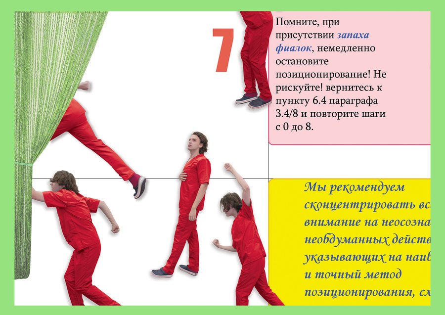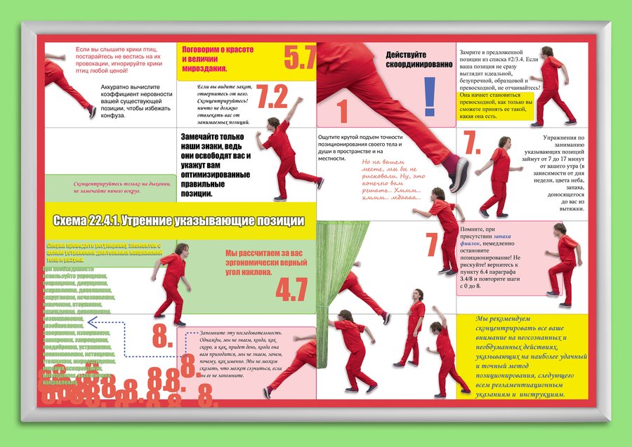 Поскольку масштаб этого явления колоссален, я выбираю не сопротивляться ему, а подчиниться и присоединиться, присоединившись к производству бесконечных инструкций. Апроприируя язык регламентов, я довожу до абсурда его многословную наукообразность, разоблачая бессмысленность и неэффективность избыточной регламентации.
